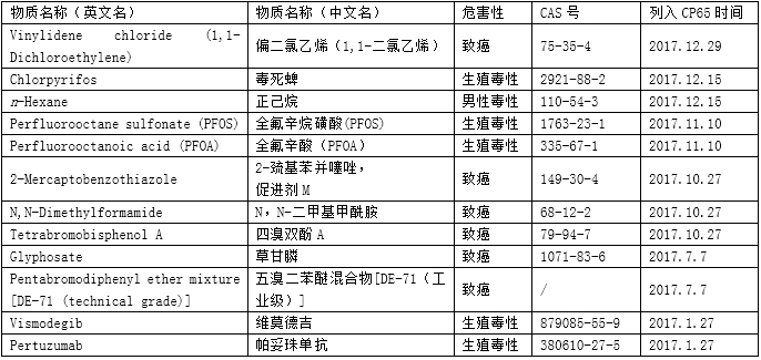 2017年12月29日,加州环境健康危害评估办公室(OEHHA)发布公告,将物质1,1-二氯乙烯添加到加州65清单中,至此美国加州65清单在2017年共进行了6次更新,新增管控物质12项,未有删除项,具体物质信息如下: