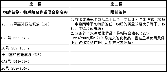 2018年1月11日,欧盟公报(Official Joual of the European Union公布欧盟委员会 (EU) 2018/35 号修订案,正式对(EC) No 1907/2006(即REACH法规)附录XVII进行修订-新增第70项限制物质,规定水洗化妆品中八甲基环四硅氧烷(D4)和十甲基环五硅氧烷(D5)的含量须小于0.1%。该法规将于法规发布后20天,即1月31日起生效。