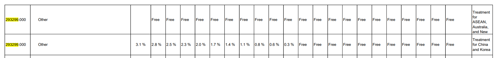 根据中国自由贸易区服务网官方网站上查询得到的信息,包含氨糖在内的293299这一大类的货物都是属于日本关税承诺表明确划定的范围的,只是对于不同国别,关税的优惠政策稍有不同。对于东盟国家、澳大利亚以及新西兰,这一类货物从协议生效期便开始执行零关税优惠政策;而对中国和韩国,则是由基础的3.1%关税开始逐年下调,在十年内逐渐下调至零关税水平。这一区别主要是考虑到地缘等因素,不过也是相当大的优惠了。